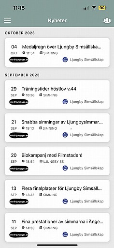 Utskick: Här ser du alla utskick du fått via mail. Du kan även se vilka av utskicken som innehåller bilagor (dessa har ett gem i övre högerkanten på utskicket). Du kan läsa utskicket direkt i appen.